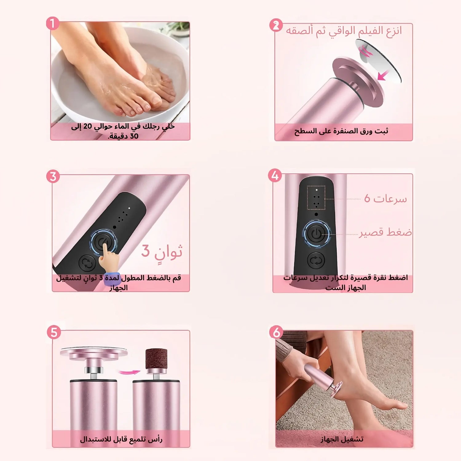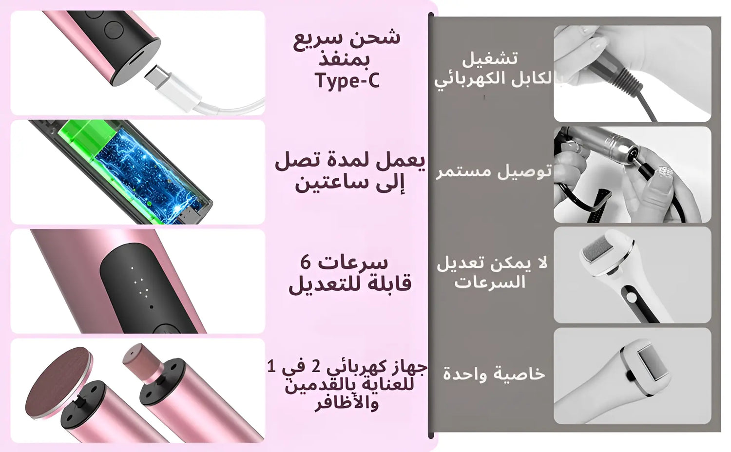 لكِ، سيدتي: إذا كنتِ تبحثين عن أداة تجمع بين الراحة والأناقة، فهذا الجهاز يمنحكِ قدمين ناعمتين وأظافرًا لامعة من أول استخدام — دون الحاجة لزيارة الصالون. بـ6 سرعات مختلفة، يمكنكِ اختيار العناية التي تناسبك، من لمسة خفيفة يومية إلى معالجة تشققات عميقة، وكل ذلك من منزلك.